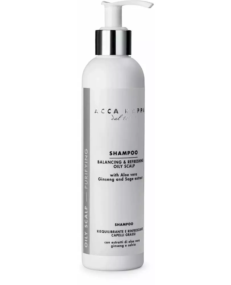 Acca Kappa Oily Scalp Shampoo balances scalp oils, promoting freshness.