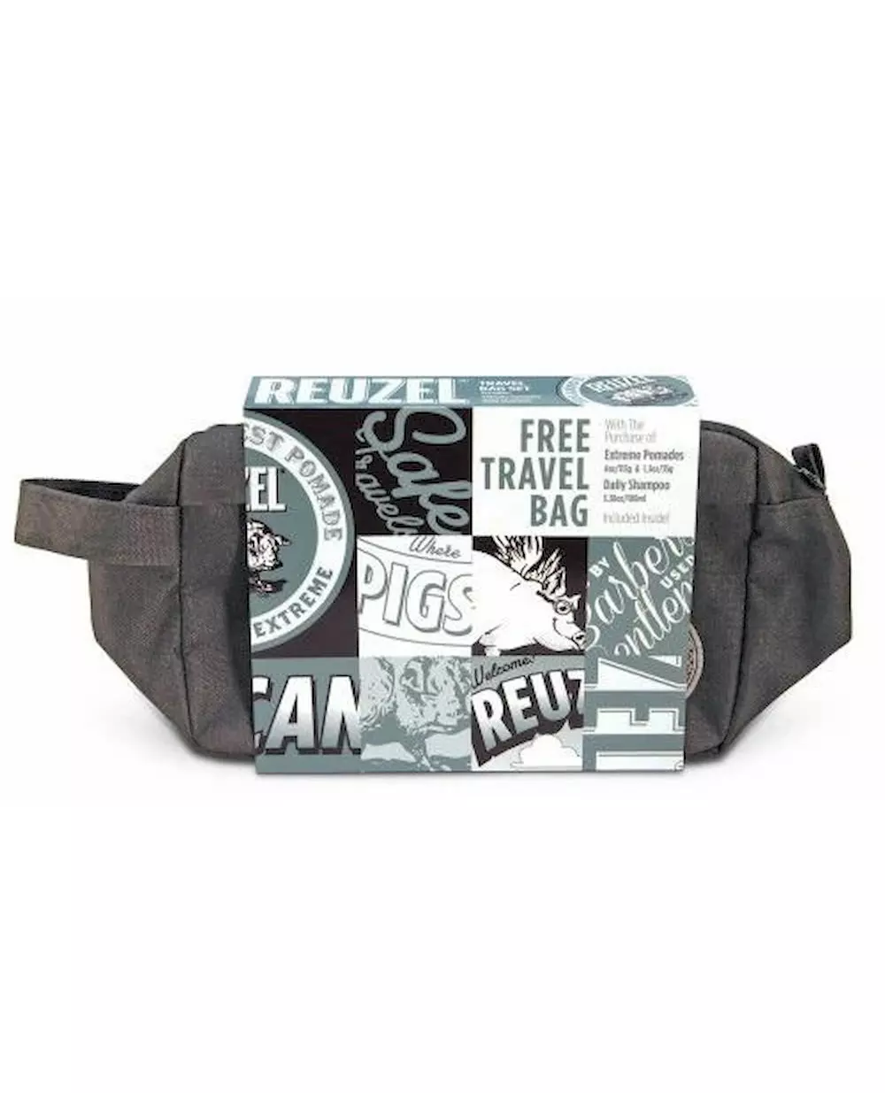 Introducing the Reuzel Extreme Pomade Holiday Travel Kit - a comprehensive 4-piece grooming set featuring two high-hold pomades, a daily shampoo, and a stylish cosmetic bag, designed to keep your hair looking impeccable while on the move.